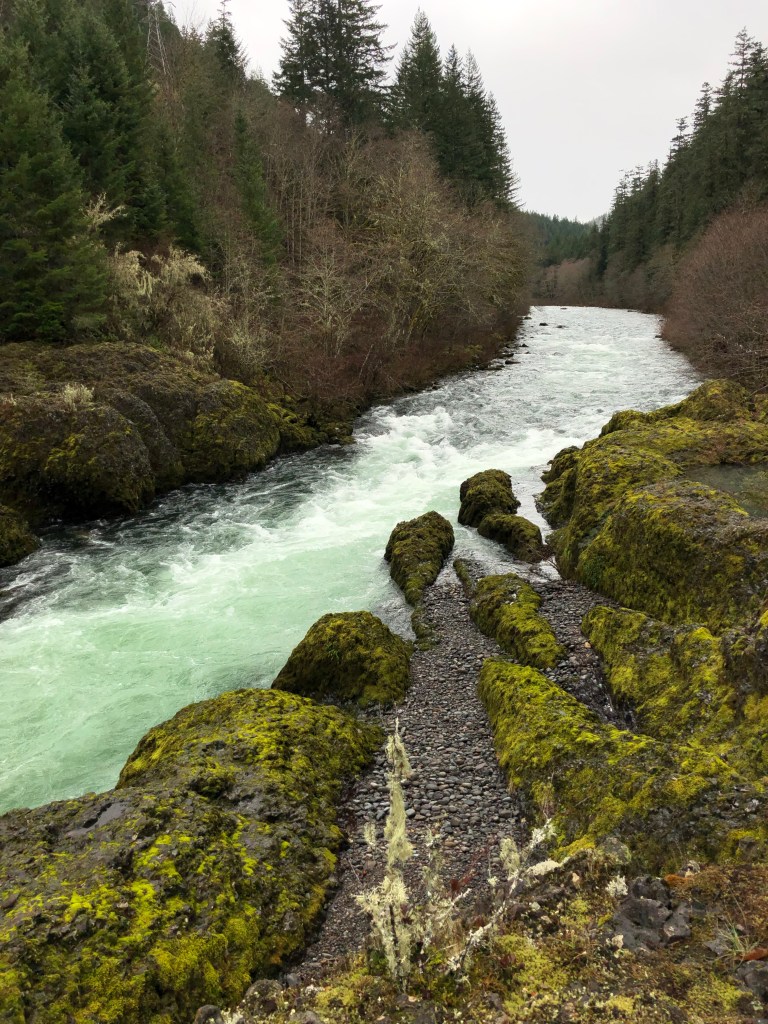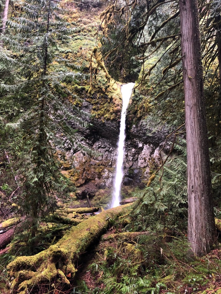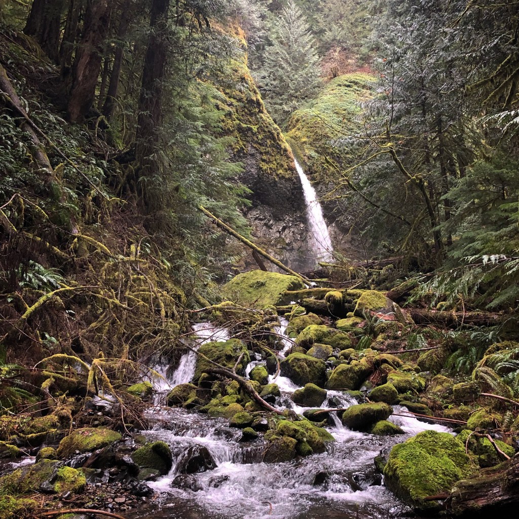 Smooth, rounded stones spread out on the fringes of the creek, and I pick my way across towards the basalt amphitheater, where water launches itself from the rim above and cascades down by graceful arch into a tidy pool below. Every inch of this place is moss laden, spongey and soft. Crossing on a high log, I find myself a spot where I can rest on a boulder and take it all in. I breathe deeply into my lungs, taking the energy of this place with me, into me, the only way I know how.
