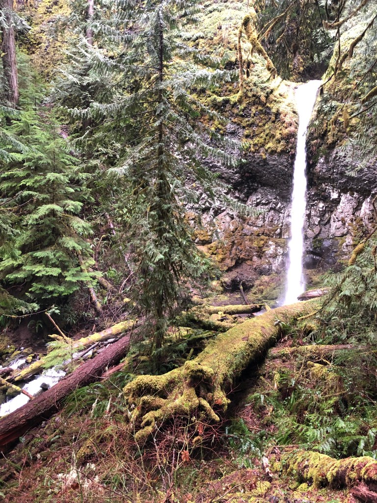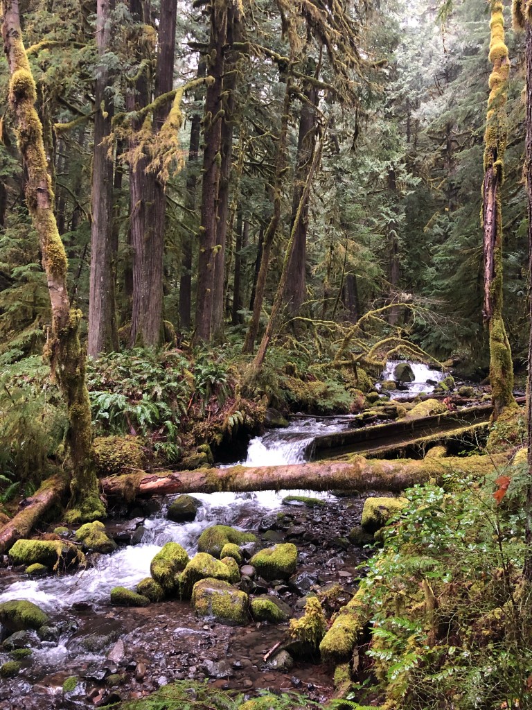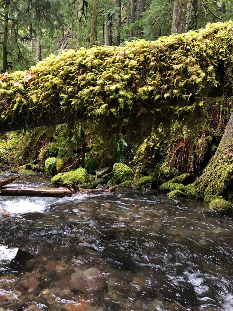 The user trail along the creek doesn’t last, soon I am plunged into the thickets of fallen logs, ferns, and sloping hillsides. I make my way carefully across the creek on a log and begin to climb up, and up. Through the vine maple understory, the earth smells like moss, soil, growing green things. My legs feel weak as I climb, my footing unsure. So I take my time, there is no need to rush.