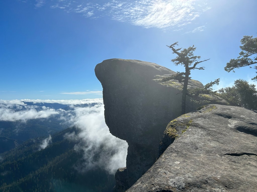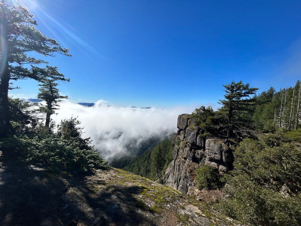 Wet rocks meant that I would not be climbing up the backside of the largest overhung rock to stand above the valley today. Instead, I wandered carefully along the edges, keeping back from the overhung ledge that sloped towards a steep drop, admiring the tiny colonies of mosses and plants that grew in the crevasses, the wind swept trees and shrubs, and the last remaining tiny flowers of summer and fall. Below me the earth rolled out and away, a thousand ridges and ravines covered in velvety southern cascades forests, resplendent with rugged terrain and lush fern gardens thriving beneath a canopy of mature trees. I studied the shapes I saw below, hoping to create a mental map of the area, or at least build some familiarity.